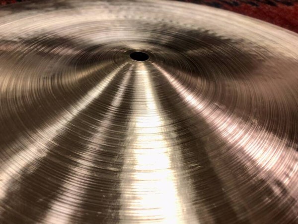 Unlike the 60s small bell ride, where we only relathed the bottom side of the cymbal, we did a full modification on this 20" small bell ride from the 80s. The hammering makes it slighty darker and complex, but the main qualities of a medium thin small bel ride are still there as well. The result is a 2060 gram shimmering and glassy ride that's full of tones, making it a real delight to play and invites to discover all the different kind of tones in the cymbal