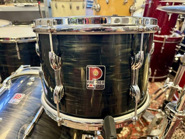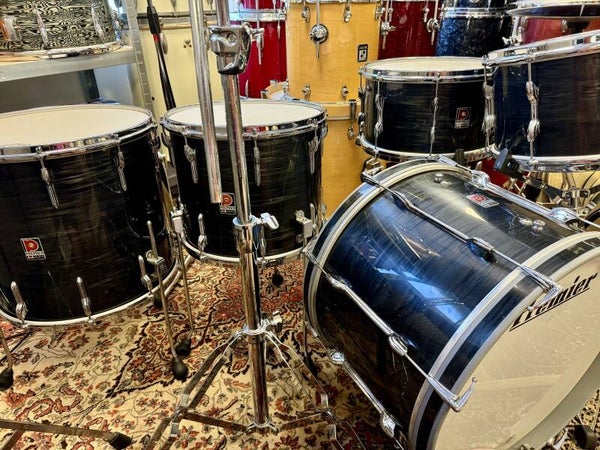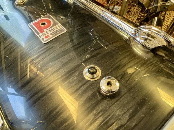 All the hardware is done with only Premier original and age correct parts, so bear barrel hoops on both sides, age correct internal mufflers, etc. The entire kit is fitted with a new gray strata wrap, which looks great, but has some spots where the wrap is coming loose from the drum and a seam that's open on the 12". These might be easy fixes but need a bit of love. Was not really a problem for me, so I left it as is.