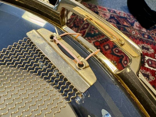 There’s a little spot on the top hoop that’s not perfect anymore and the inner tag comes a little loose from the shell (see pictures). For the rest, the snare is immaculate condition!