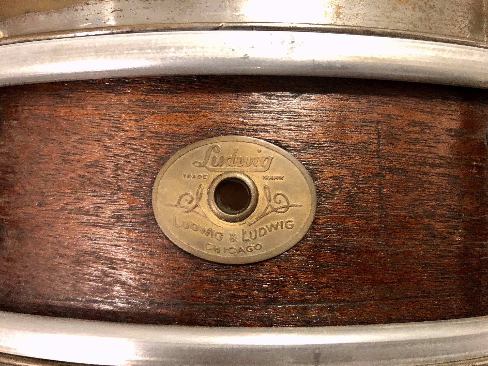 1920s Ludwig & Ludwig 15" x 4" Solid Mahogany Dance Model snare with reinforcement rings. One of the first models with the 8-lug seperate tension lugs and straight (un flanged) "stick chopper" hoops.