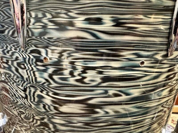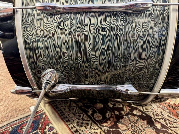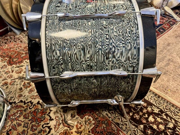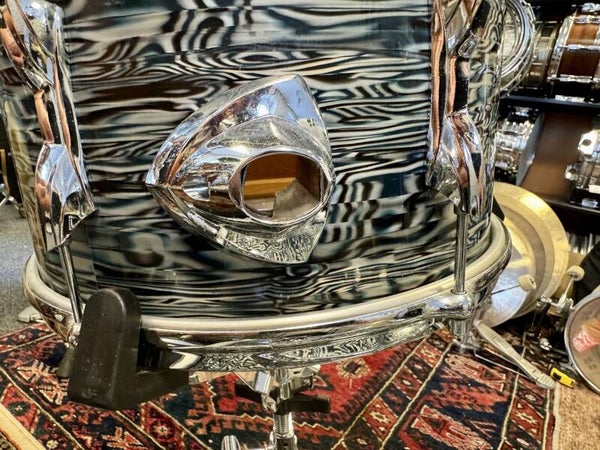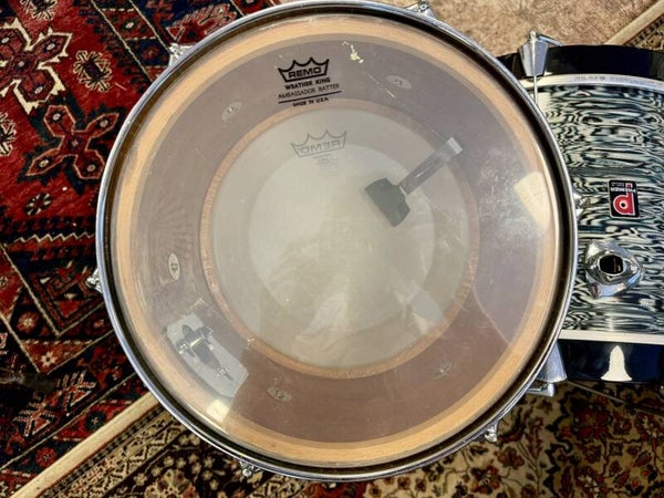 This kit is not a museum piece, as the pitures show as well. The wrap has been restored for as good as possible can, but there were many cracks which you can still see if you look closely. The floortom even has 4 extra holes in them due to some metal stick holder that was drilled onto the floortom. Unfortunately the internal muffler on the 16" is missing as well. The hoops of the bassdrum were no longer there with the kit, so we got 2 brand new maple hoops in black gloss finish. The good thing is that all the original die cast Premier hoops are still there on the toms. The tom mount and all parts to adjust is propperly on the kick are also missing, so you'd have to put it on a snare stand as pictured (not included), or you'd have to source the missing parts. The internal shells of the 12" tom and the kick are pretty good, but as the pictures show, the inside of the floortom has some serious rash.