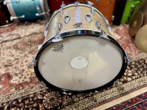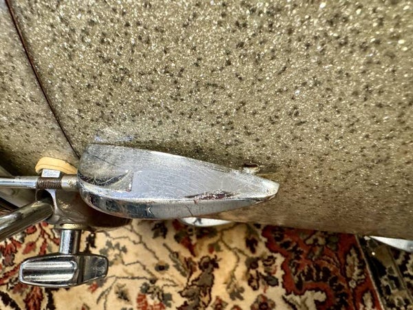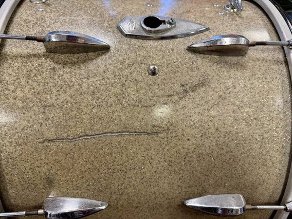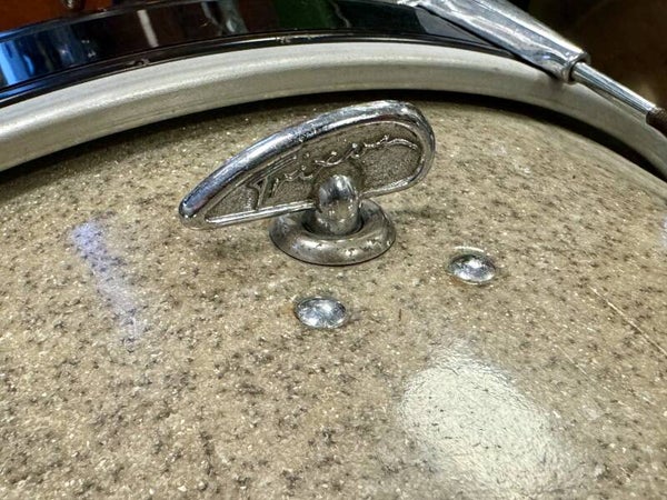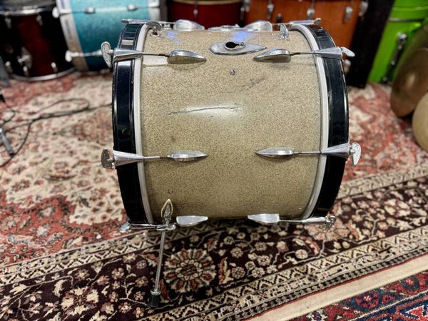 1960s Trixon 20" x 14" Bassdrum with the 'teardrop style' lugs. It's complete and almost completely original but definitely in a players grade condition. The wrap shows some heavy discoloration and clear signs of heavy usage. The sound however is still fantastic! Only real issue with this bassrum is that one of the lugs needs to be replaced due to a broken screw that's stuck in the lug. We might have one somewhere laying around and would of course replace it before shipping once we do.