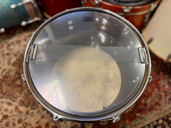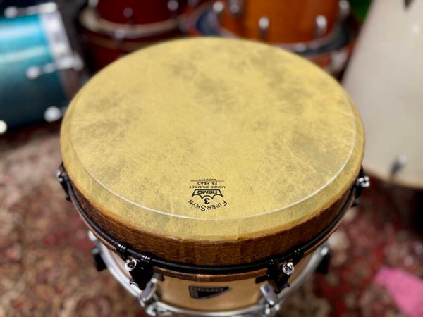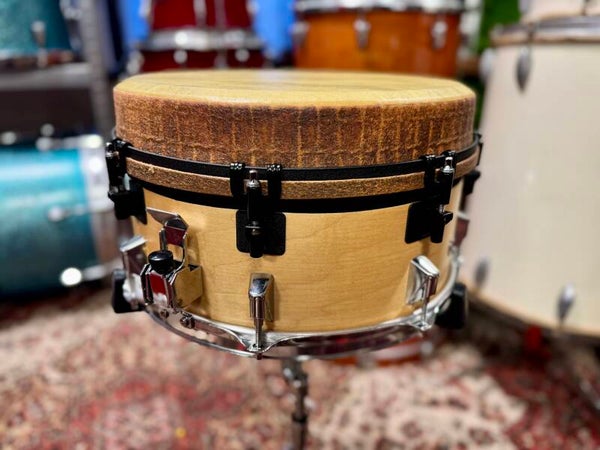 Very rare 14" x 7,5" Remo Mondo Snare in natural finish in excellent condition. The conga style top head looks as if it's never been played and so does the shell! Only thing that needs to be mentioned is the spot at the seam. Looks odd to me and not sure if this is normal, or if a very small strip seams to have come loose on the outer ply (see picture). For the rest it's as if it just came from the box!