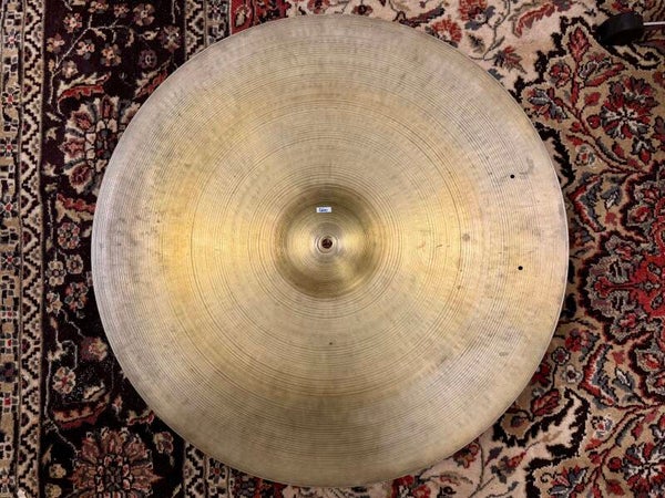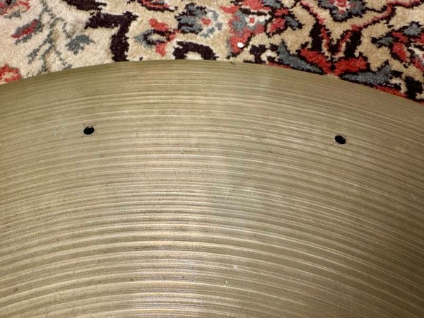 22" Zildjian Avedis 1960s Medium Ride drilled for 2 rivets (installed for the video). The holes are not exactly at the same distance from the edge, so pretty sure these are a re sult of a DIY venture. The cymbal has a weight of 2610 grams making it a proper medium ride. It has quite a low pitch for a cymbal at this weight, which is pretty nice and works great with the rivets! Nice wooden and semi smokey stick definition without loosing the Avedis brightness in the overall tone profile (see video).