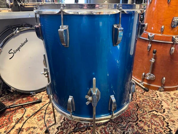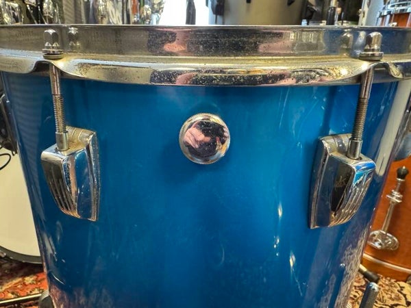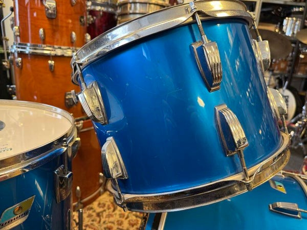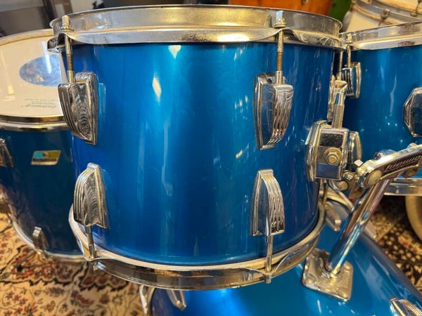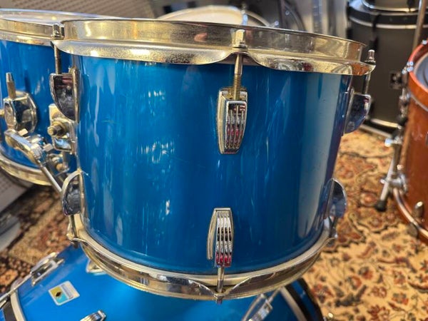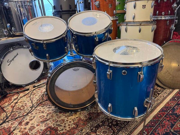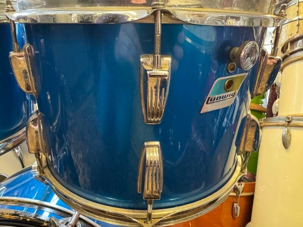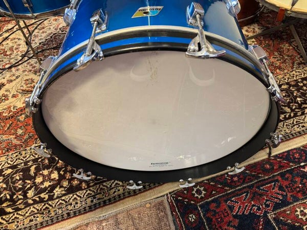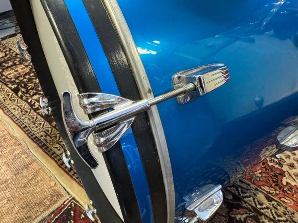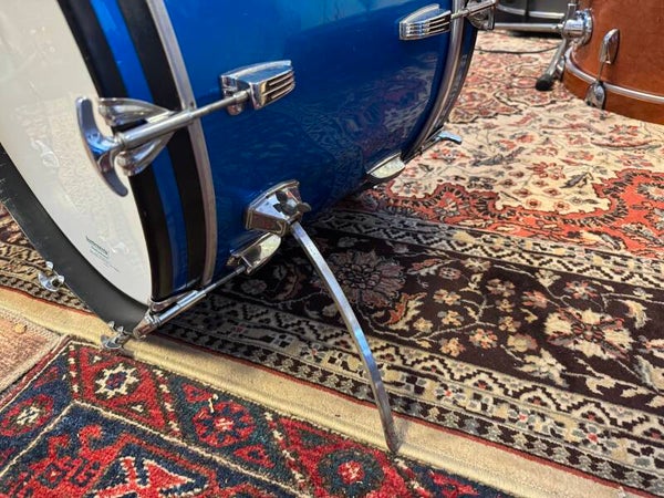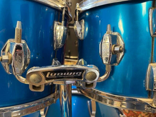 Players grade satin blue Ludwig blue/olive badge "big beat" kit. This kit has 3-ply shells with rerings, making it very resonant and warm. It's the same kind of shells as the super classic. Main difference is the extra tom and the fact that the toms are on a tom post and not on a rail.