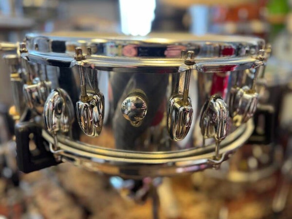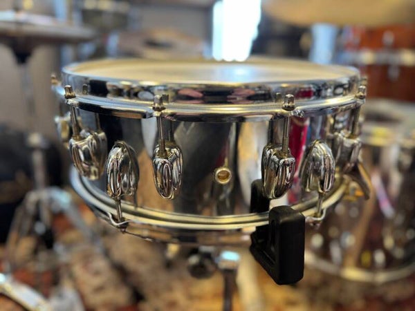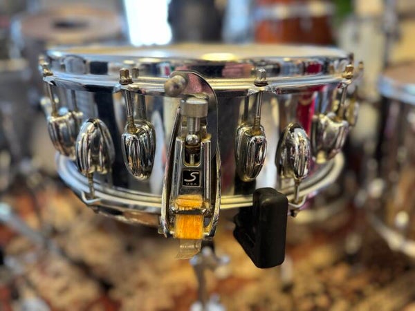 14" x 5" chrome over wood Slingerland 2-to-1 snare, with 12 lugs on top and 6 lugs on the bottom. The 12 lugs on the top allows you to tune the snare in any direction you want. With the stick saver hoops and the wooden shell, the snare is articulate but will keep it's warm tone nomether in which tuning you use it.