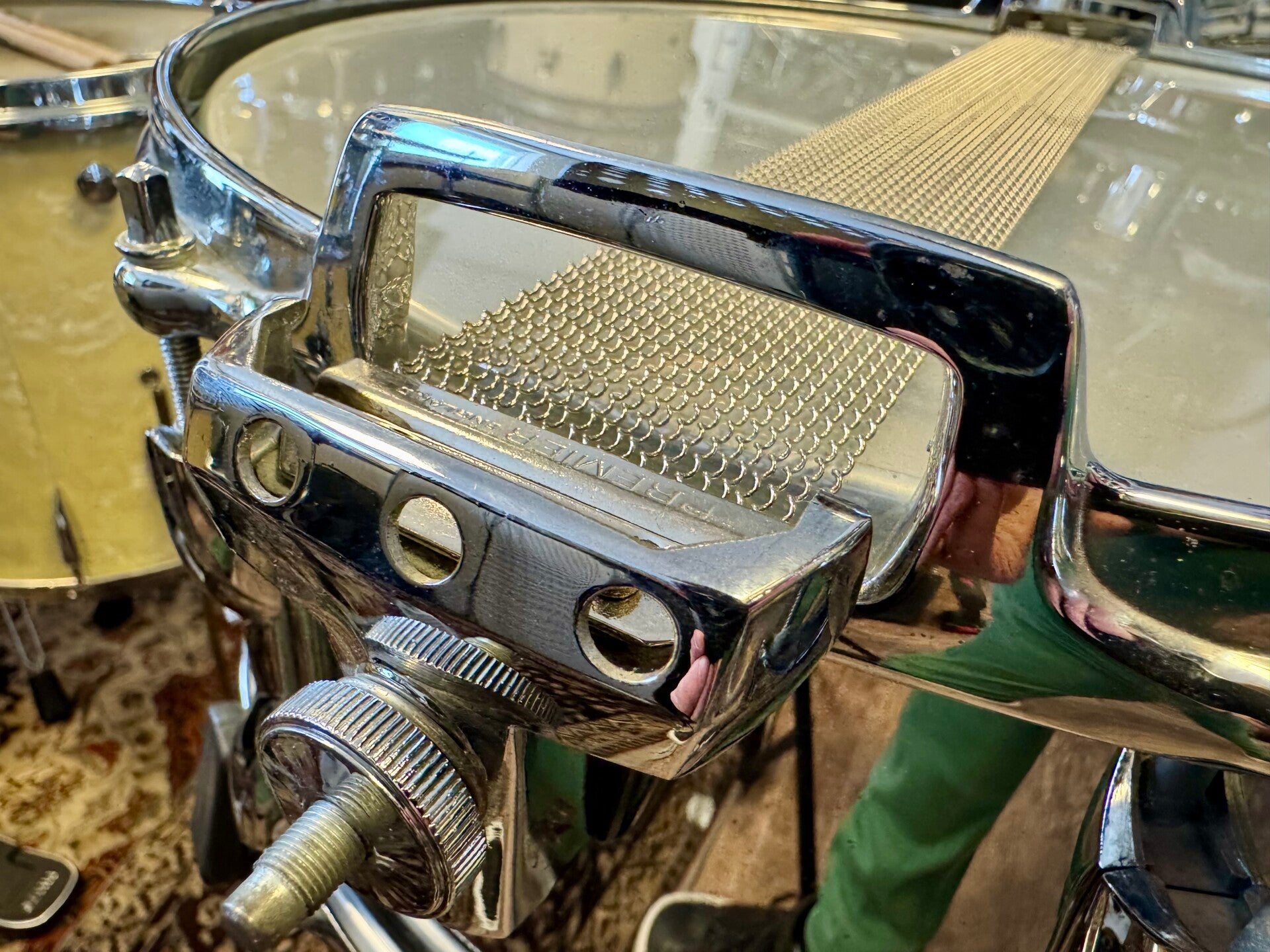 14" x 6,5" Premier 2003, the bigger brother of the more common 2000 model. A chrome over aluminum shell with the 2000 series flow beam throw off and parallel mechanic and the fantastic die cast Premier hoops. These snares are, in my humble opinion, just as good as the Ludwig Supraphonic, but cheaper. Most of these 2000-series snares are, like the Ludwig supraphnics, in terrible condition with a lot of pitting, but this particular one is still in great condition. It has the original muffler in it as demonstrated in the video.