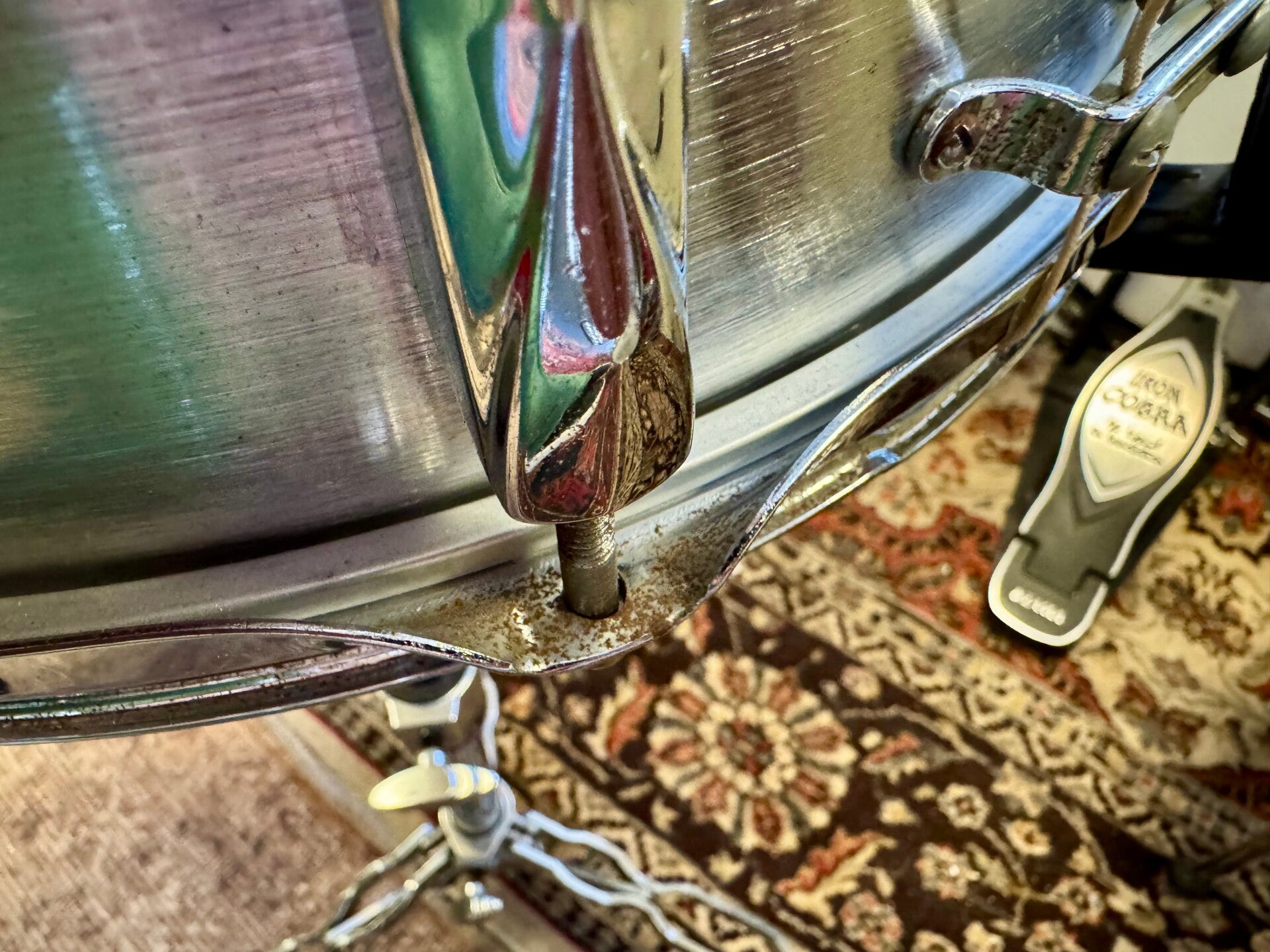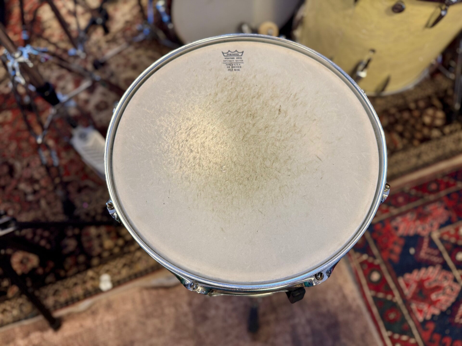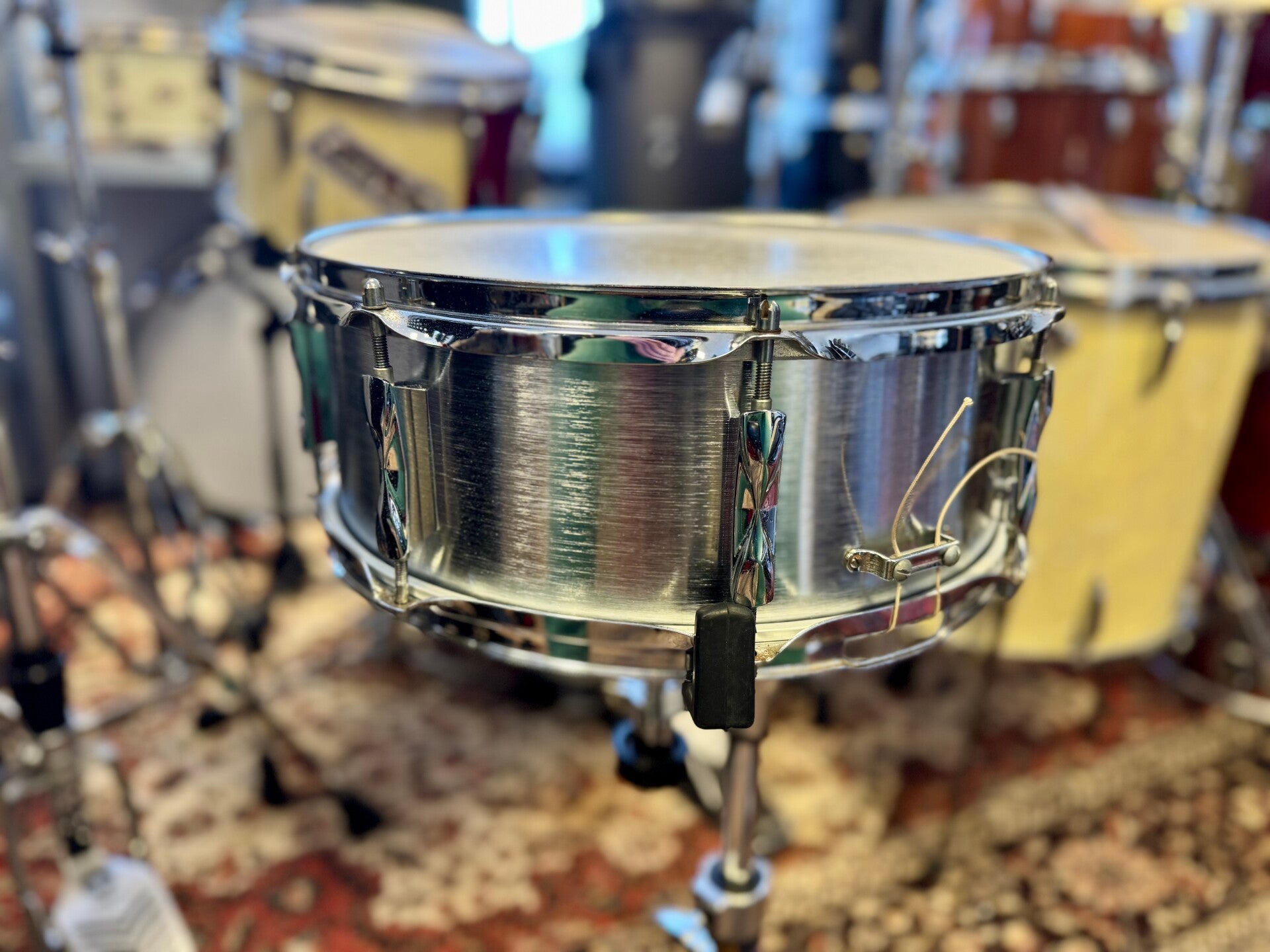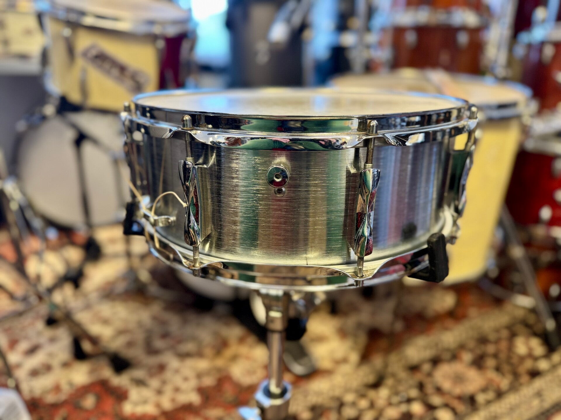 Very rare and excellent condition 14" x 5" Olympic Brushed Aluminum snare. The snare is similar to the famous brushed aluminum snare from Premier, but then with the flanged hoops instead of the die cast hoops and different lugs. The sound is warm and compact as can be expected. A lot of bang for the buck on this one.