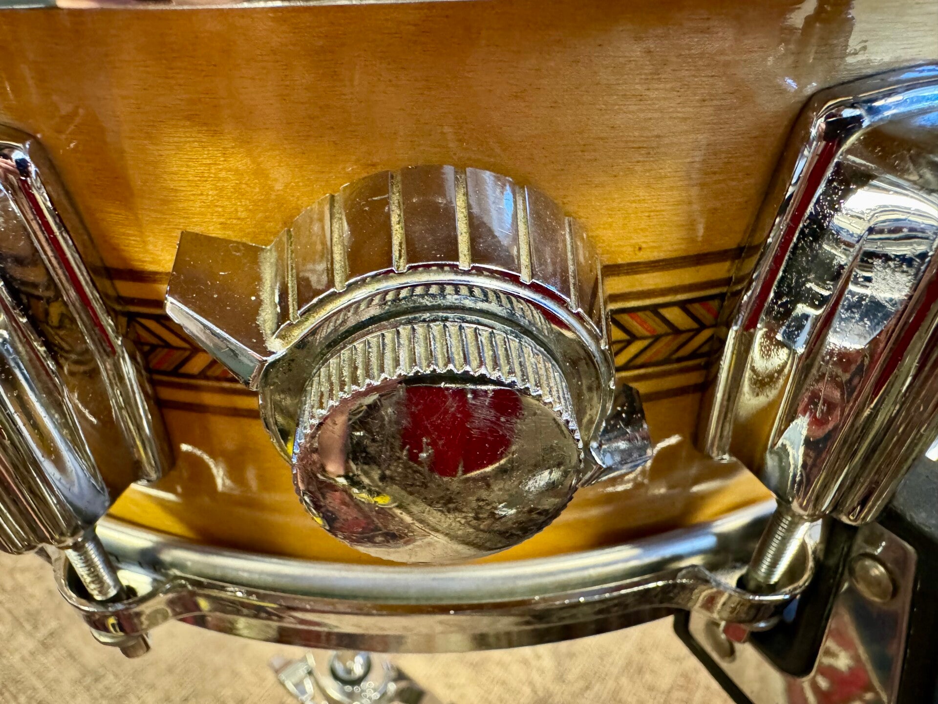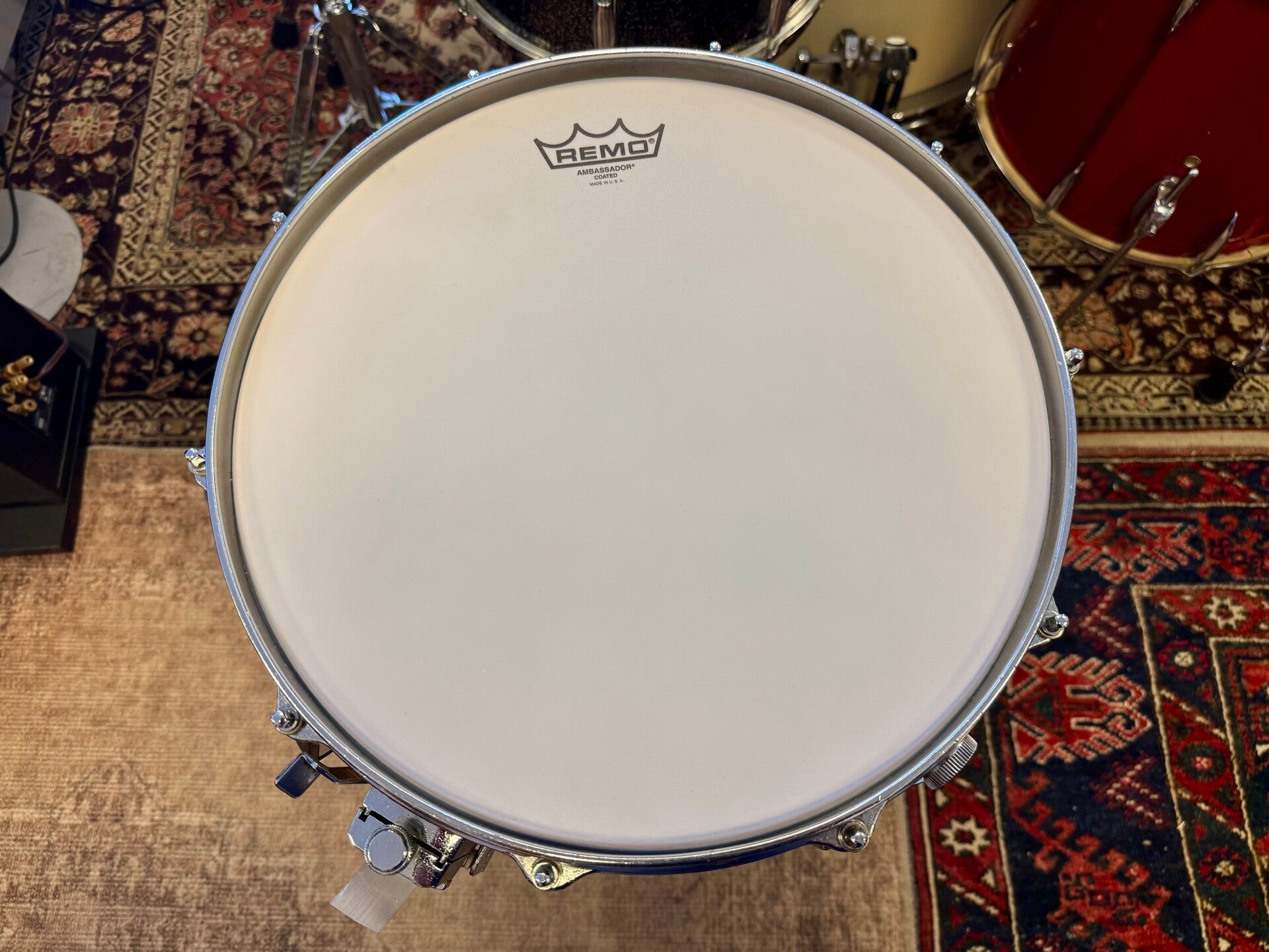 The snare is complete and with all the original. Not sure of the snare wires are the original or the Re-issue. There’s brand new Remo Ambassador heads on top and bottom.