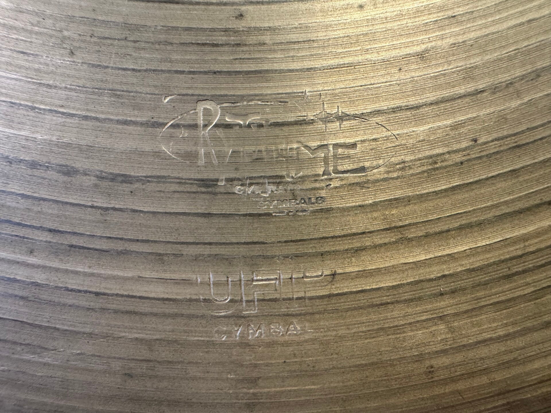 19,5" UFIP Rhythme Medium Crash Ride (basically an undersized 20"). Like most UFIP rotocast cymbals, this ride has a bright, yet wooden and smokey stick definition, a strong bell sound and a relatively short decay. With its weight at 1940 grams it has a great crash as well, making it a great versatile cymbal.