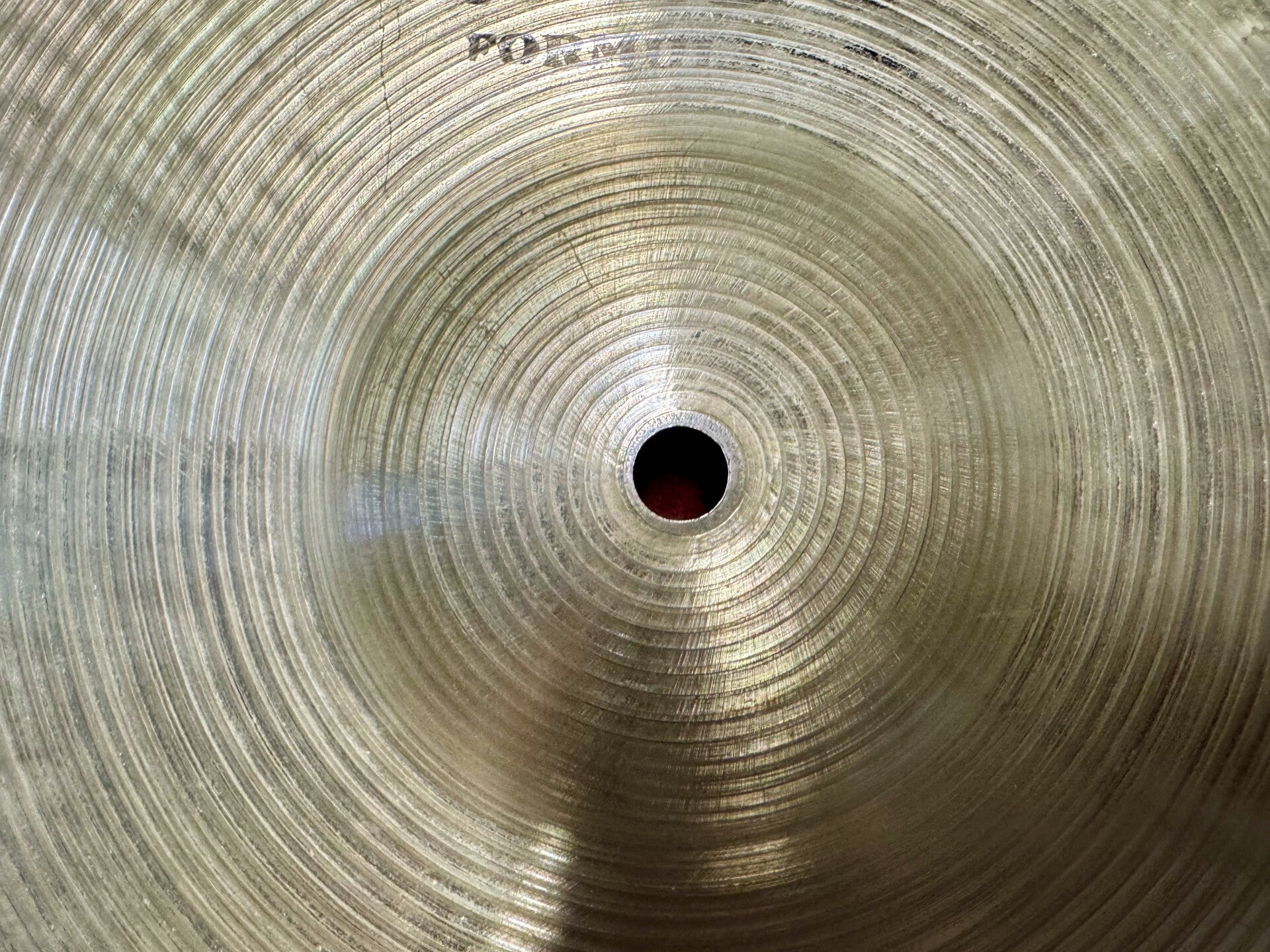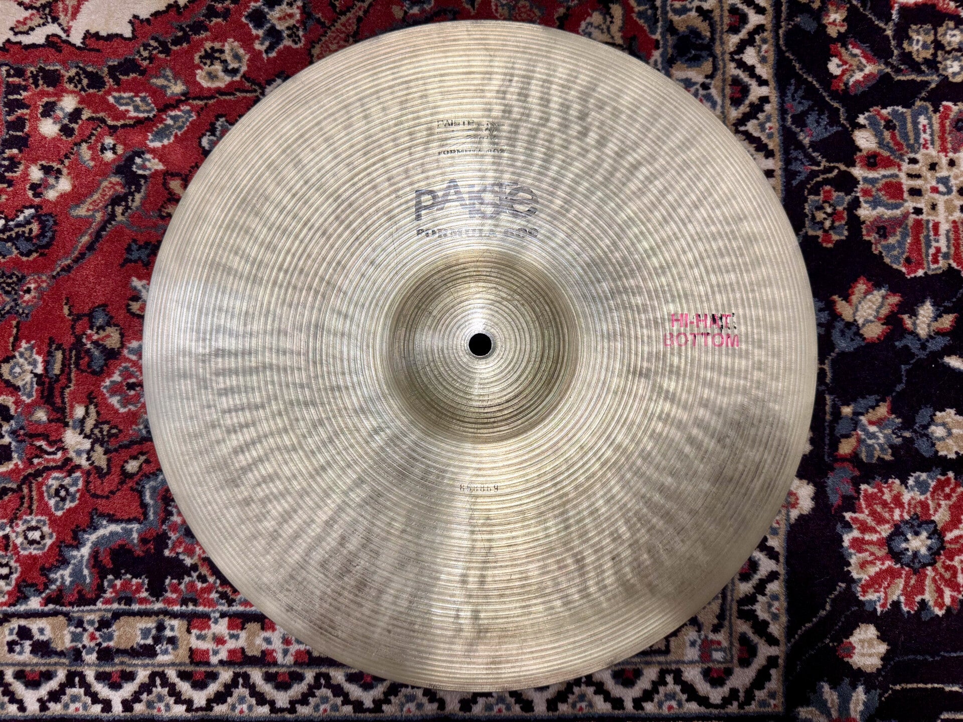 15" Paiste 'Formula 602' Hihat. The top is from 1978 and the bottom from 1981 so it's not a factory matched pair, but they fit together perfectly. The top has a weight of 980 grams and the bottom comes in at 1075 grams.