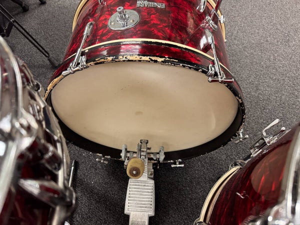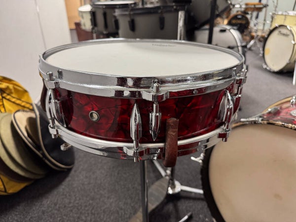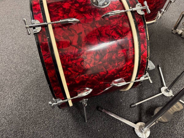 The set contains a 20" x 12" bassdrum which is nice because it's shallow but also super light weight with a great open sound. The cymbal arm on the bassdrum is of course also part of the kit. The floortom is a 16" x 15" shell with reinforcement rings and die cast hoops, aswell is the 14" x 4" snaredrum. The throw off on the snare is original, but something you'd might consider to change for something more modern, conventient, although it's also pretty cool as is.