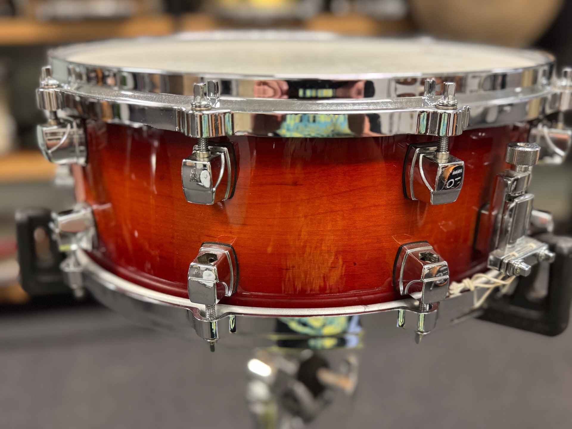 14" x 5,5" Yamaha maple snare from the Sensitive Series in a beautiful antique sunburst finish. This discontinued snare has a 7-ply maple shell and aluminum die-cast hoops. The snare is (besides the top head) in mint condition. Very responsive and versatile due to it's big tuning range