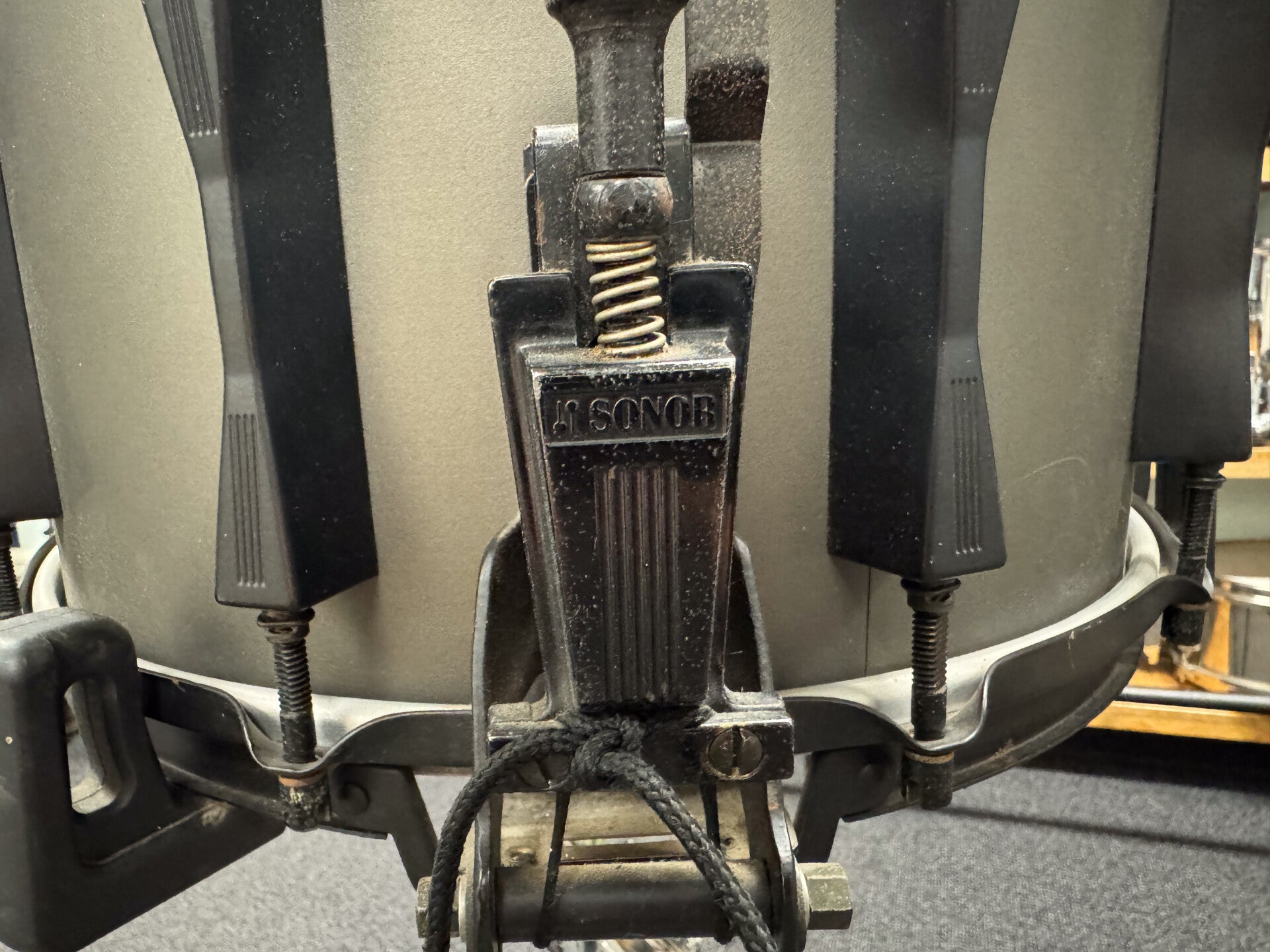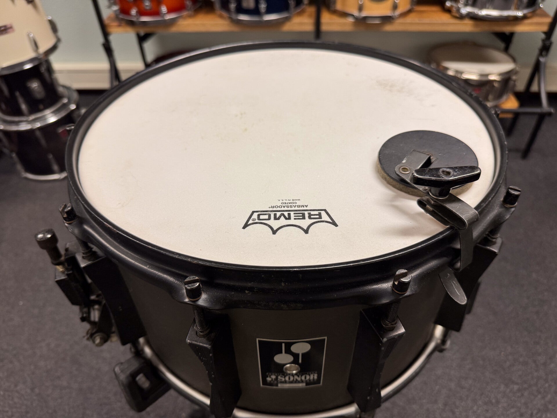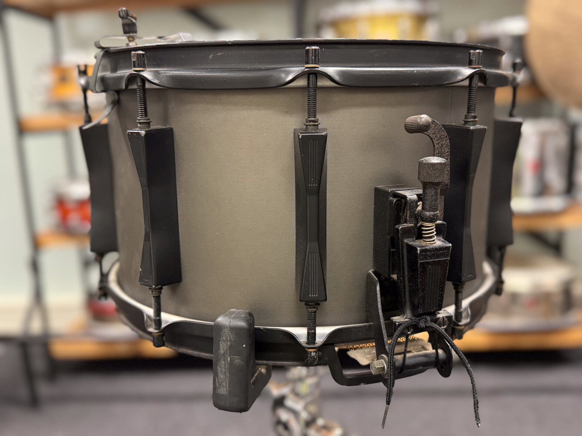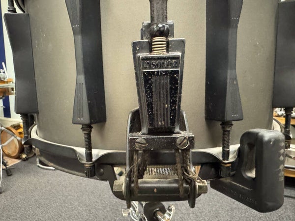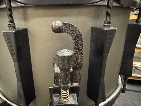 Players grade 14" x 8" Sonor Phonic Snare in the famous gray Hi-Tech finish dressed in black hardware. The 9-ply beech shell is in very good condition. All the black hardware though, is in pretty bad shape and has some spots of rust as well. The snare is priced accordingly of course!