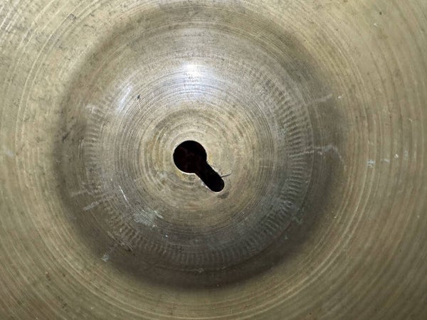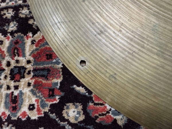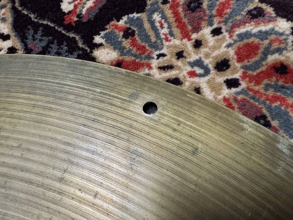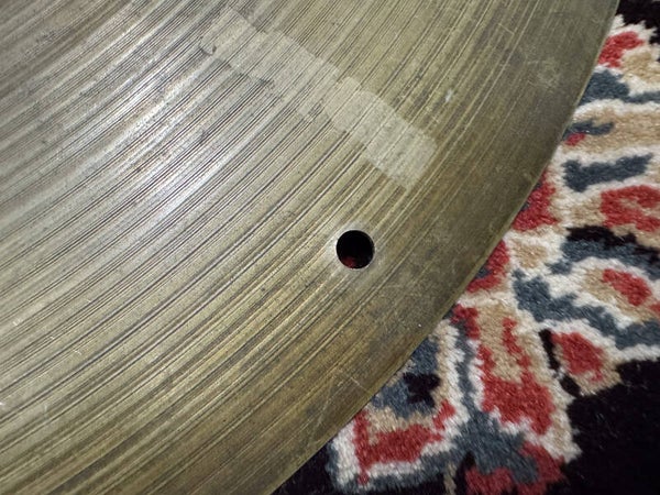 Unfortunately the cymbal has a huge keyhole and a former owner did a very bad job in removing the rivets. These holes had to be enlarged to fix this to make sure it wouldn't crack. This of course doesn't harm the sound, just the looks and therefor the price as well.
