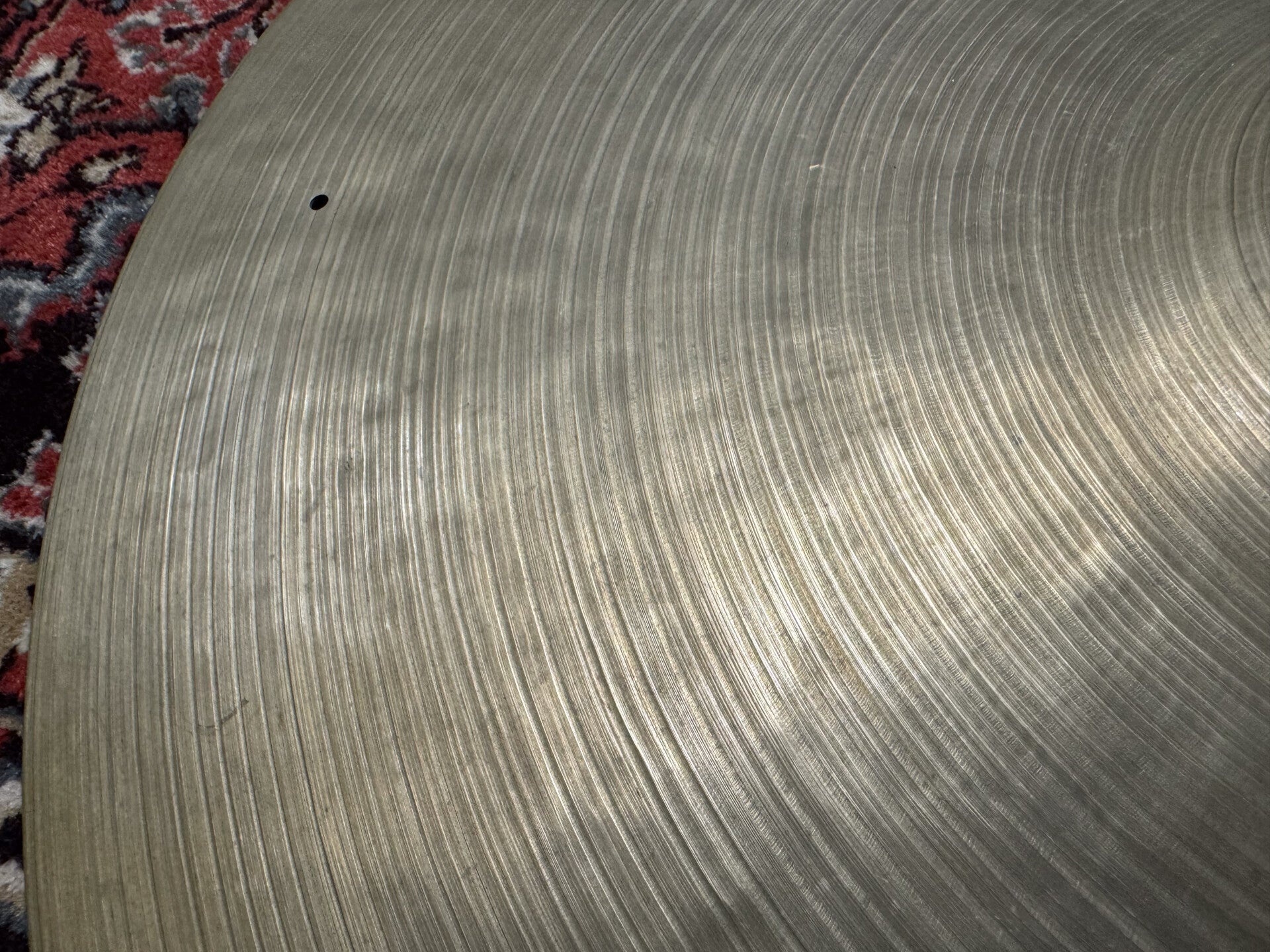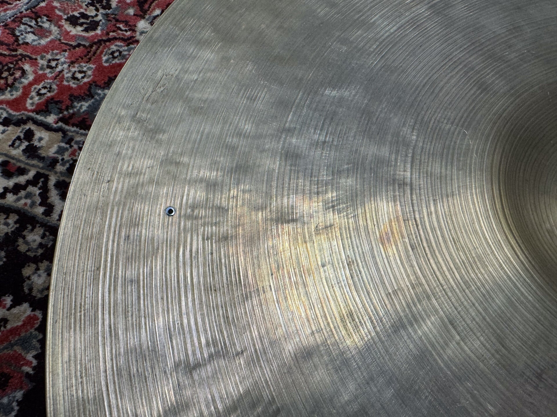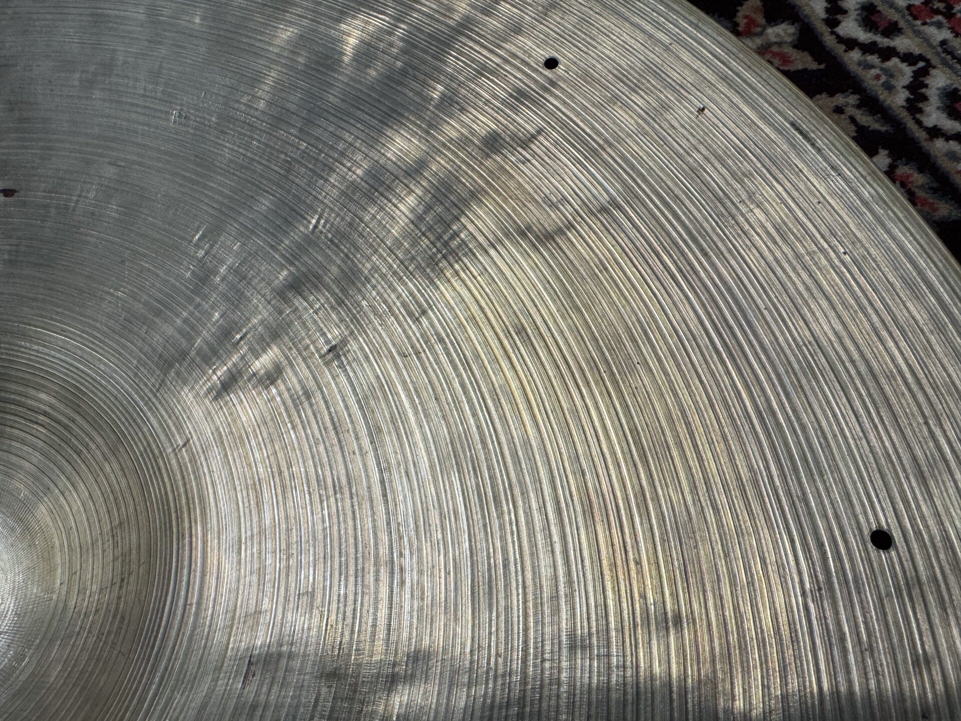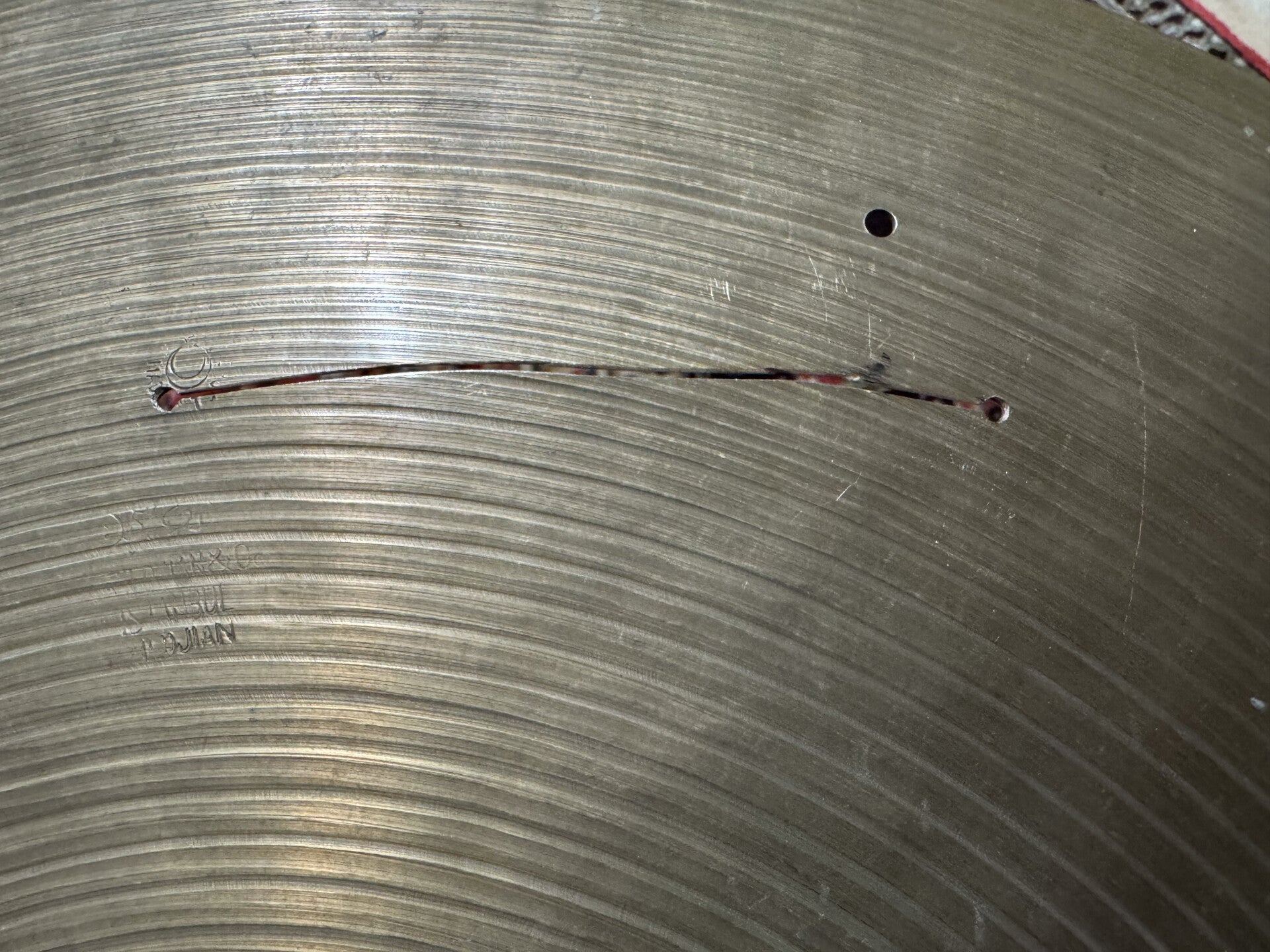 Meet "scarface", a 20" K. Zildjian Intermediate Stamp at a perfect weight of 1870 grams. Unfortunately this cymbal has taken some serious battle scars along the way... There's a big crack fix as clearly can be seen in the video as well, and also the center hole had a big crack that had to be fixed, hence it's nick name. The cymbal has 8 rivet holes, of which 3 are installed for this video.