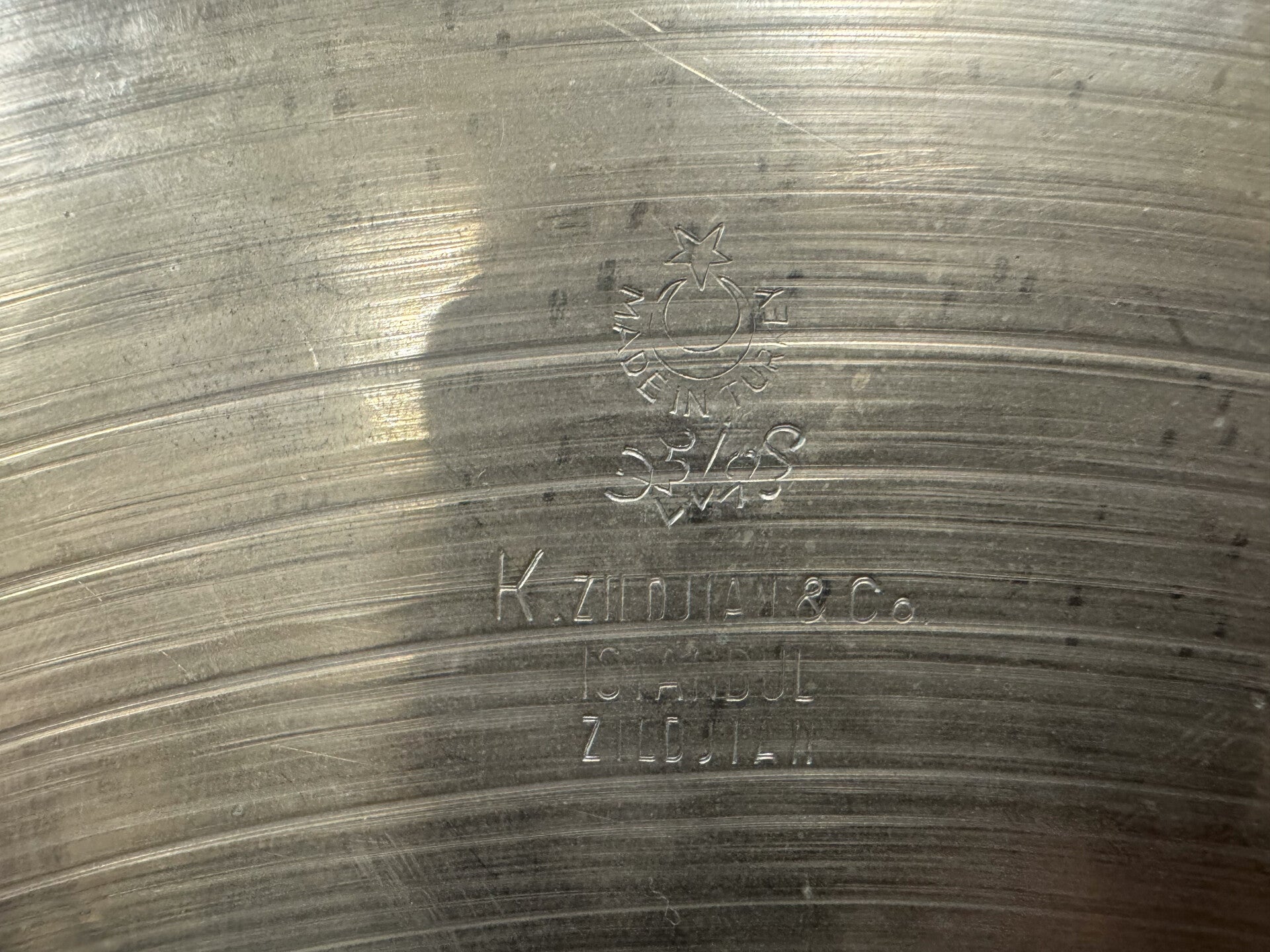 This 20" K.Zildjian New Stamp Ride (made in Istanbul) is a perfect example of how all these K's are different and have their own character and story to tell. This one is pretty stiff and gives the cymbal a lot bright and complex over tones in the mid range. The lathing grooves are also very fine, so it's almost like playing a brilliant cymbal with this one. A former owner installed 2 rivets in the cymbal to give it a bit more of that 60s jazz vibe, which I think works pretty nice for this cymbal, so I left it as is.