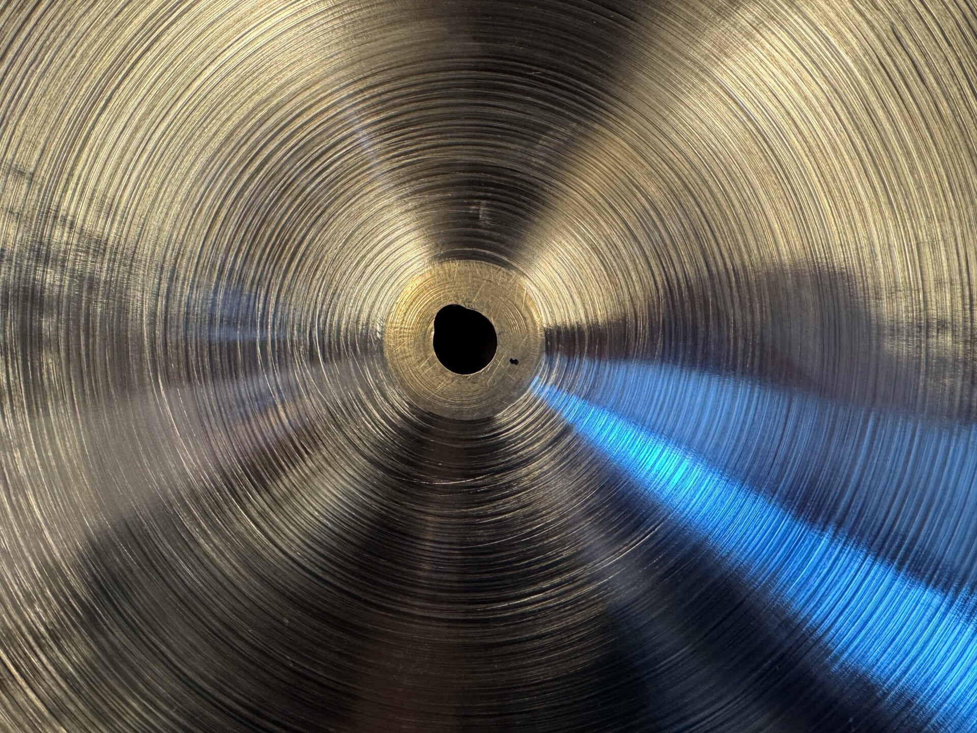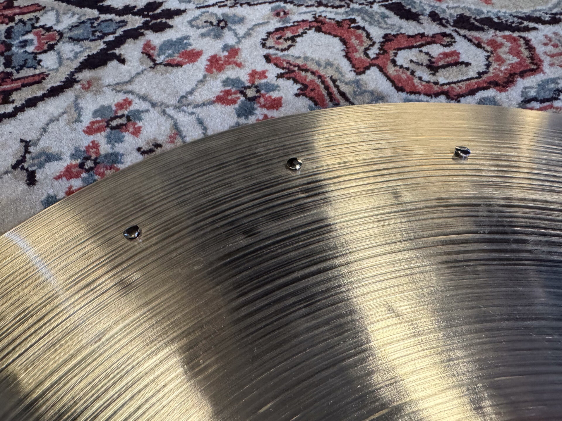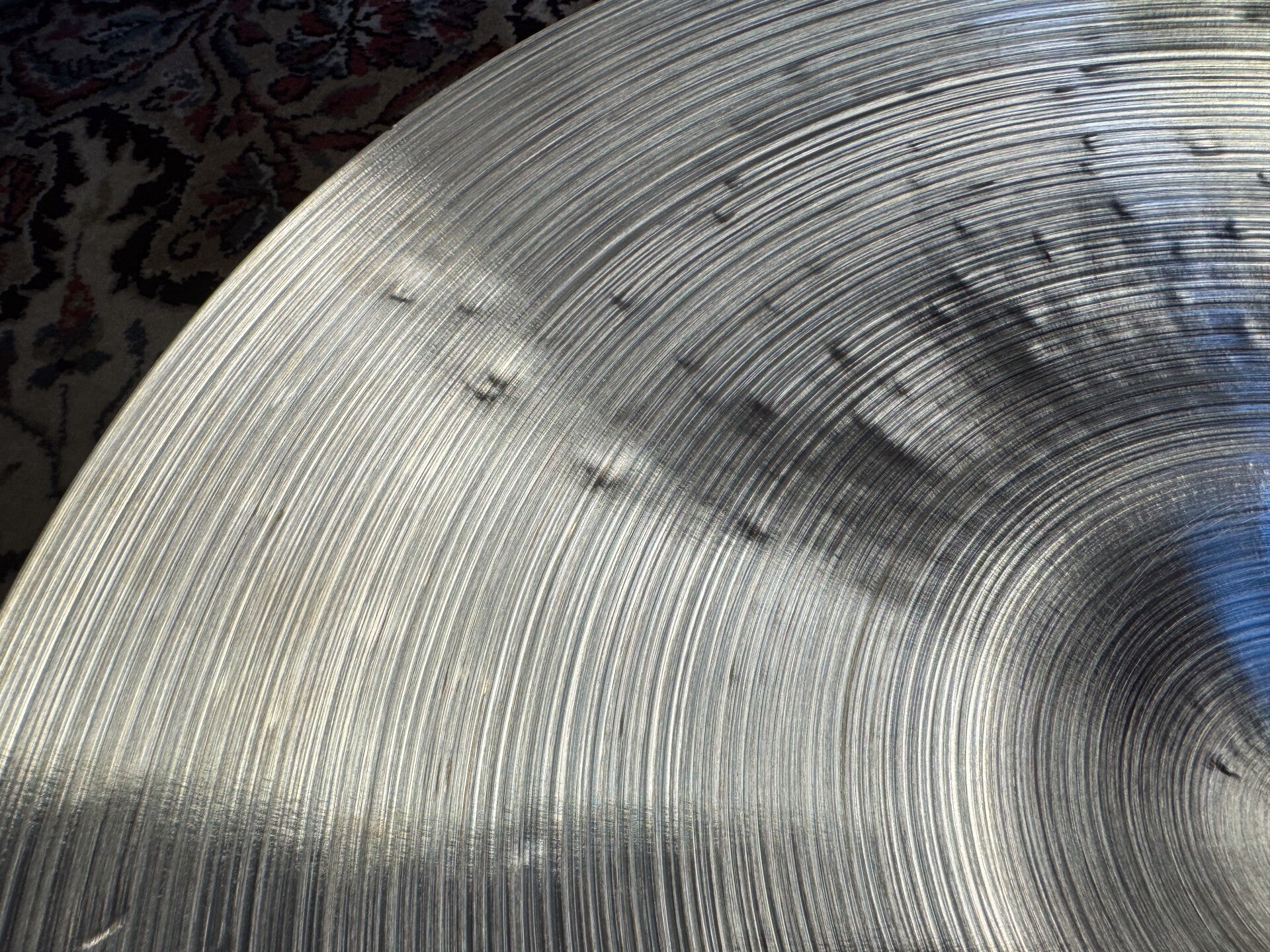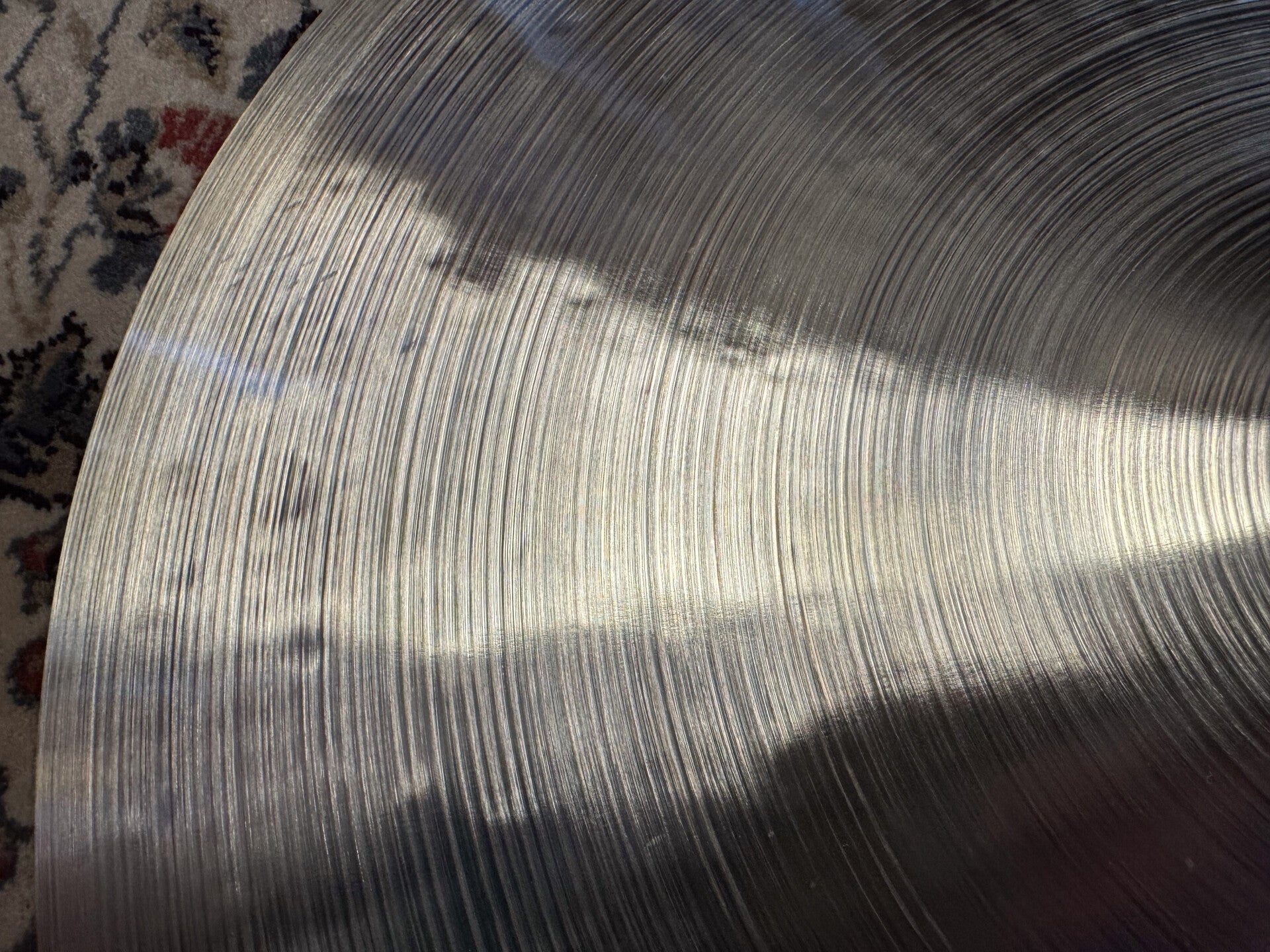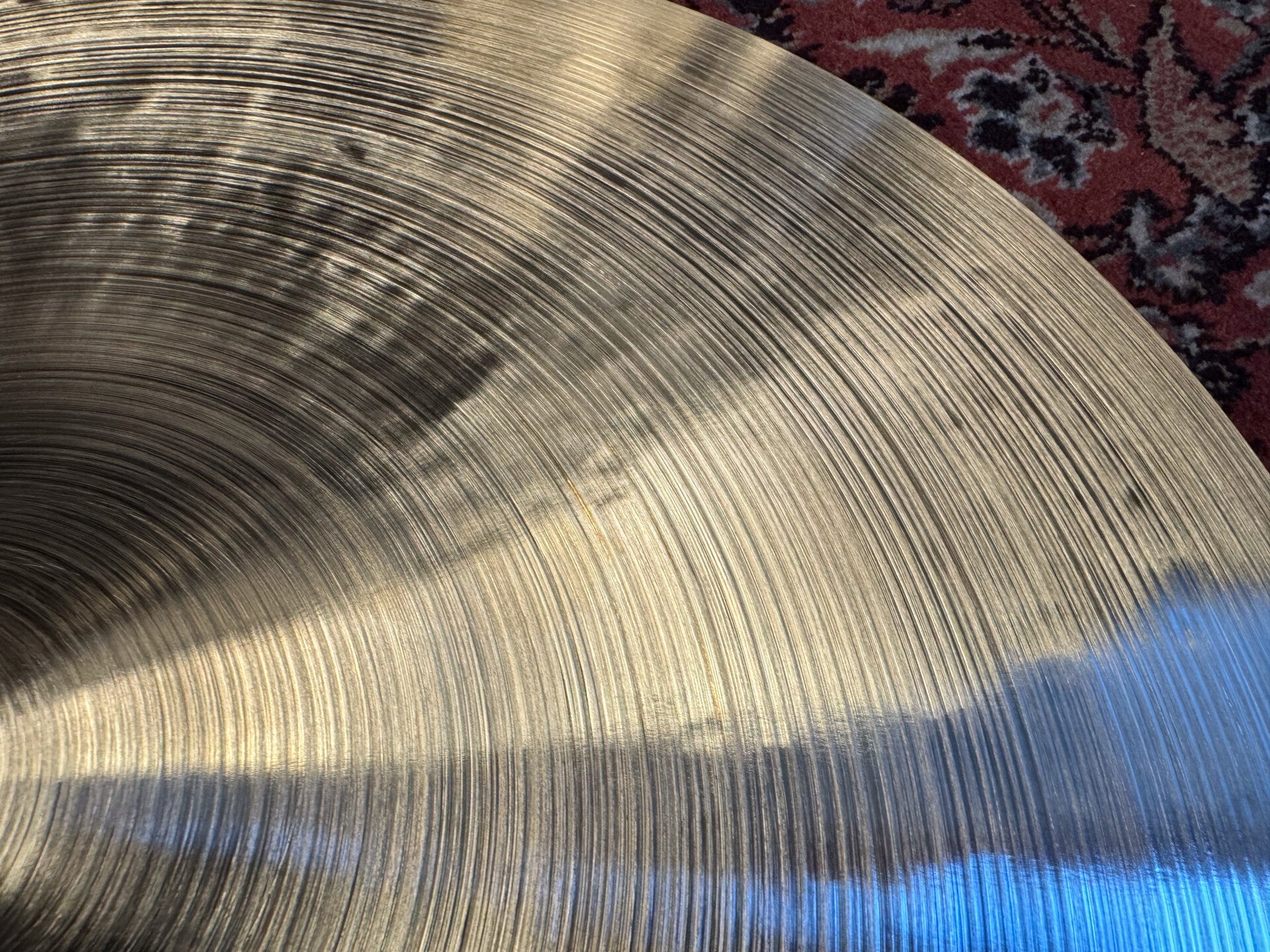 A 20" modified Zildjian Avedis Sizzle Ride. It used to be a heavy dingy ride, which we gave a nice amount of hand hammering and fresh lathing on the top and bottom side of the cymbal, to take it's weight down to 1880 grams. It results in a well balanced bright, articulated cymbal with a great crash and a perfect amount of rivets.