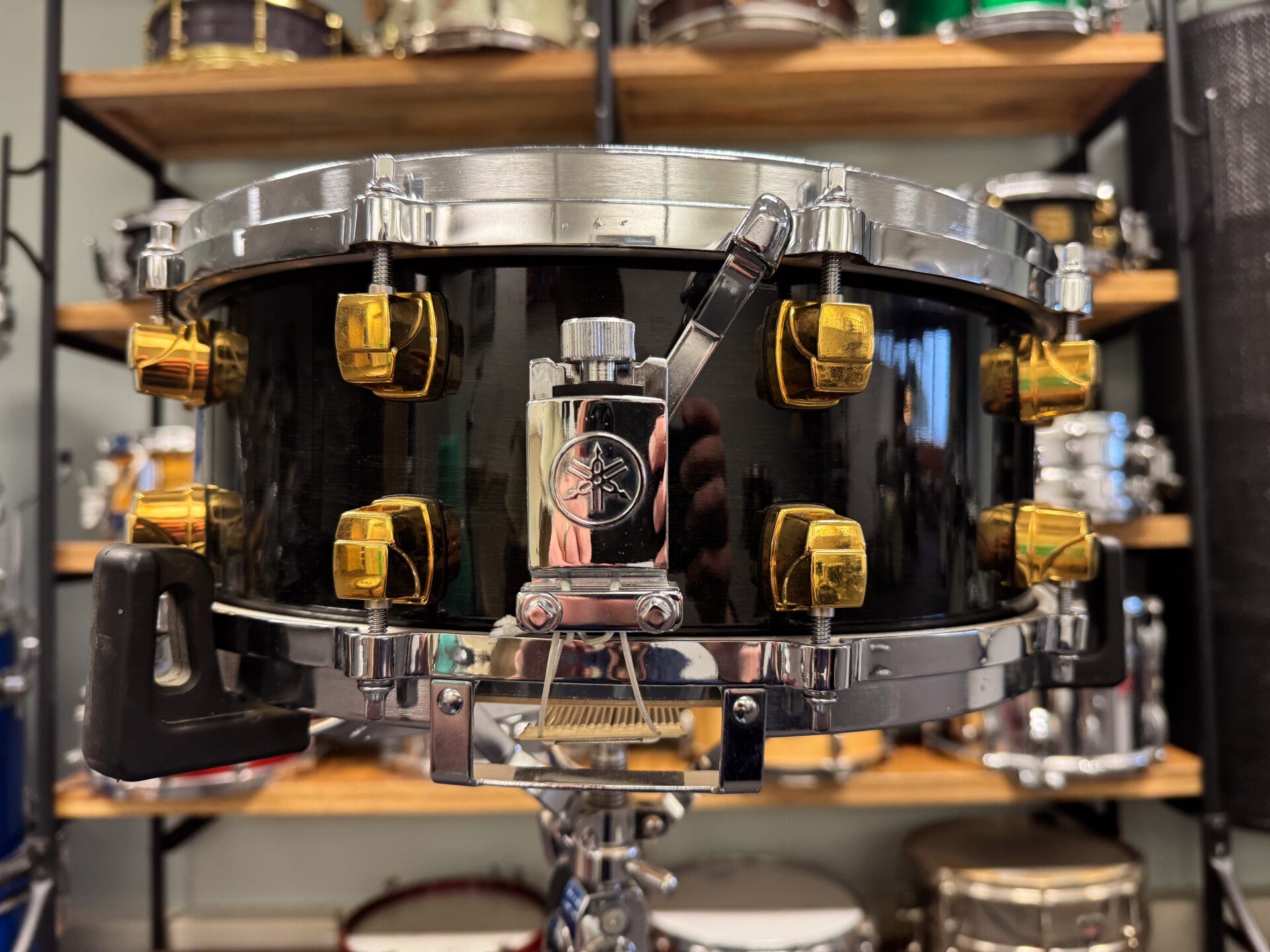 Excellent condition 14” x 5,5” Yamaha Maple Custom snare in Black Maple finish. Compaired to most other black maple drums I’ve seen, this one is on the dark side of the specrum.