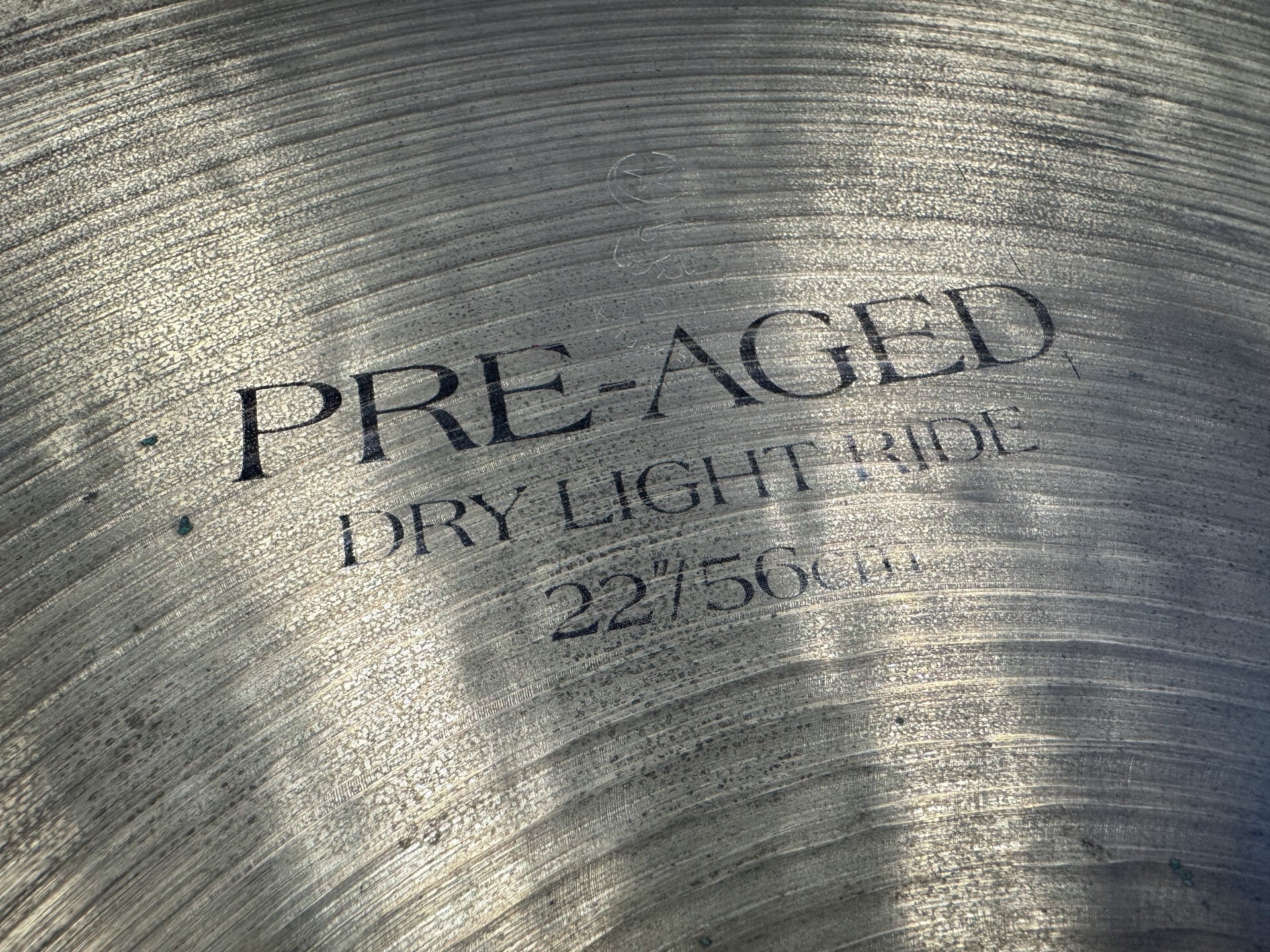 Very rare 22" K. Zildjian Pre-Aged Dry Light Ride at a perfect weight of 2430 grams. It's less dry then you'd expected based on the name. The dry side of the ride is partially in the stick definition, which is still bright and articulated, but more in the length of the sustain, which is great, because you can crsh the cymbal without it being in the way of the music. The bell is bright and fulln witout becoming too loud.