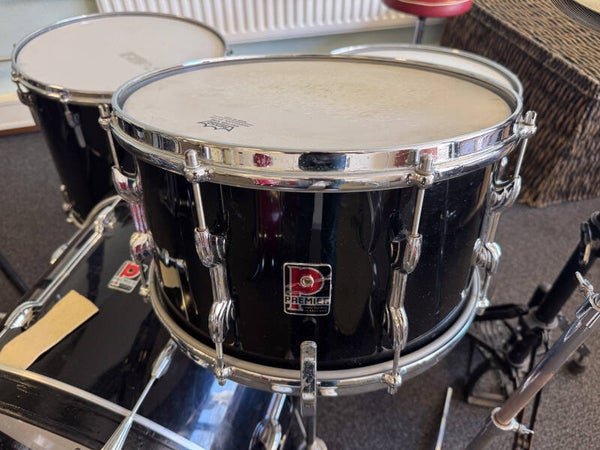 Players grade Premier kit from 1960s, which has been refinished, so not everything is original and in used condition, but it still has that amazing Premier 60s sound and the inside and edges of the shells (the most important parts) are still in amazing condition! The kit also comes with the matching 14" x 5,5" Royal Ace which is an absolute killer snare, which runs smooth and the wires are sitting on the bottom head nice and flat. The hoops are the classic 60s bear barrel diecast hoops.