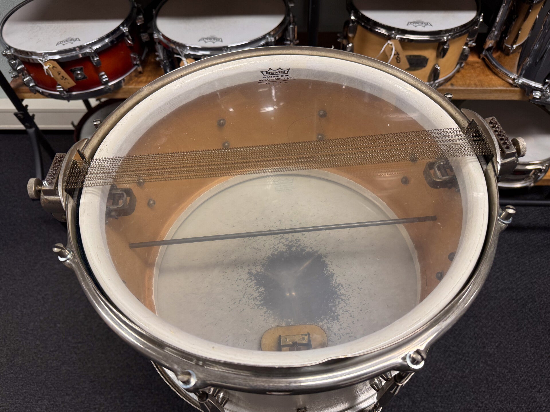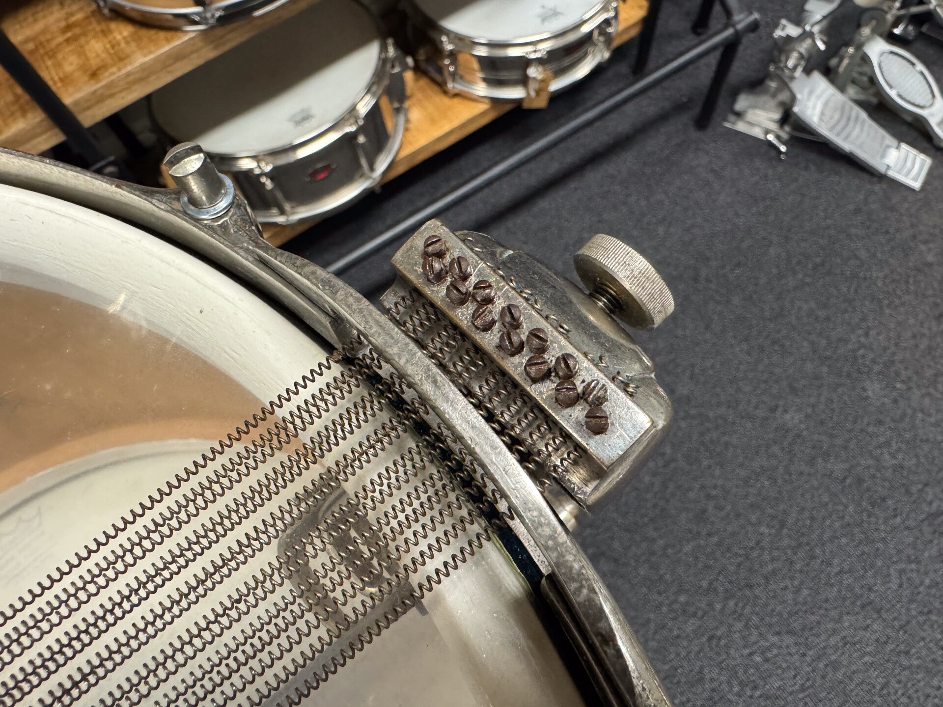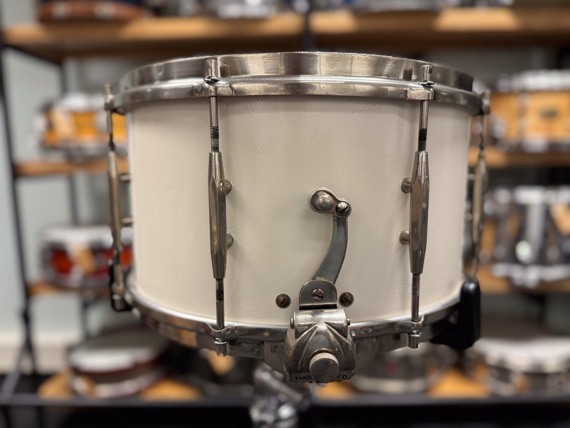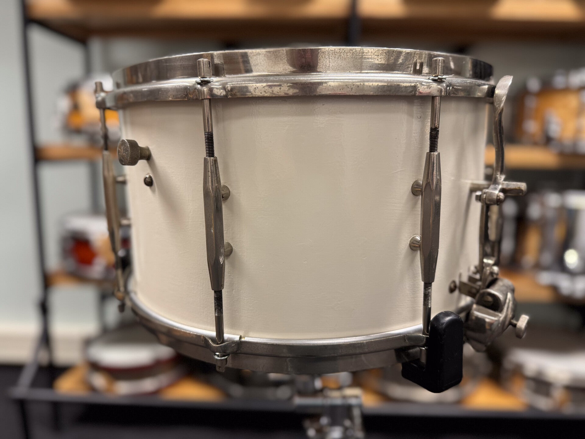 This vintage snare sounds incredible. It has a nice open and resonant sound. The big throw off for the parallel mechanism gives the snare a very classy and elegant look. All works great and smooth. Only issue is a dent in the bottom hoop. The finish is a repaint.