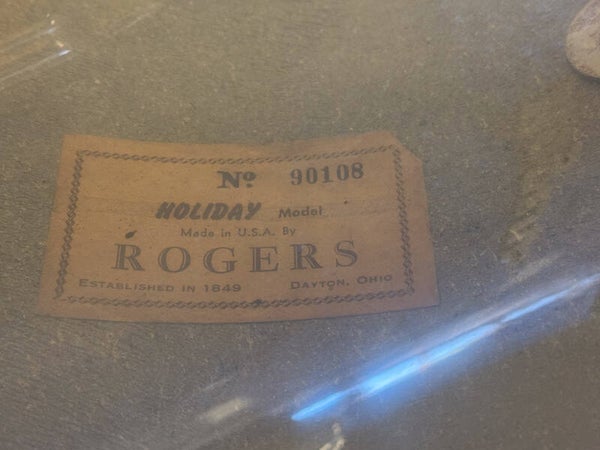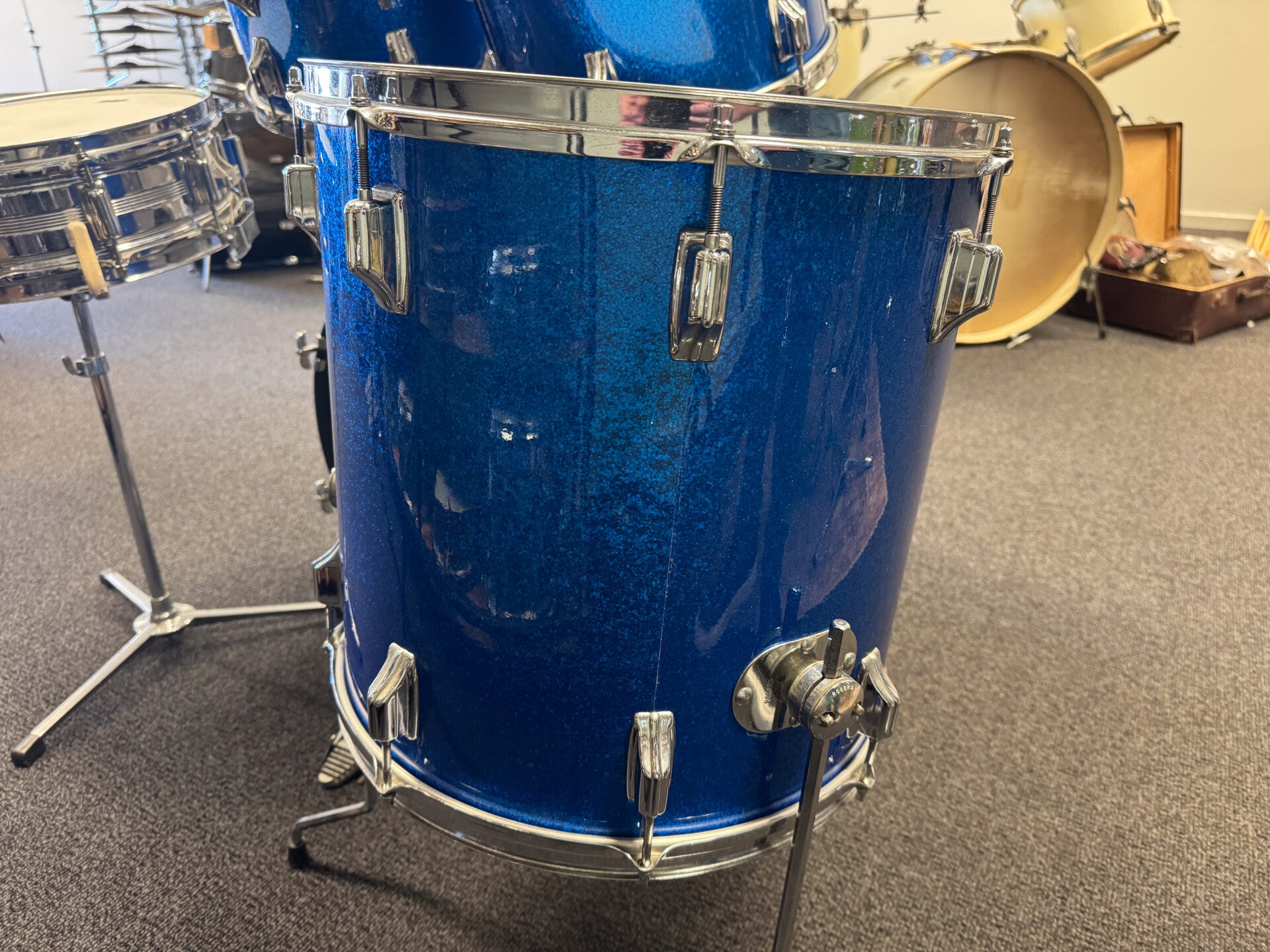 Beautiful Rogers Script logo kit from the 1960s in the sizes 12" and 13" mounted toms, 16" floortom and 20" bassdrum. It's a mix of Holiday and Powertone shells and the whole kit has been rewrapped professionally in this beautiful blue sparkle finish.